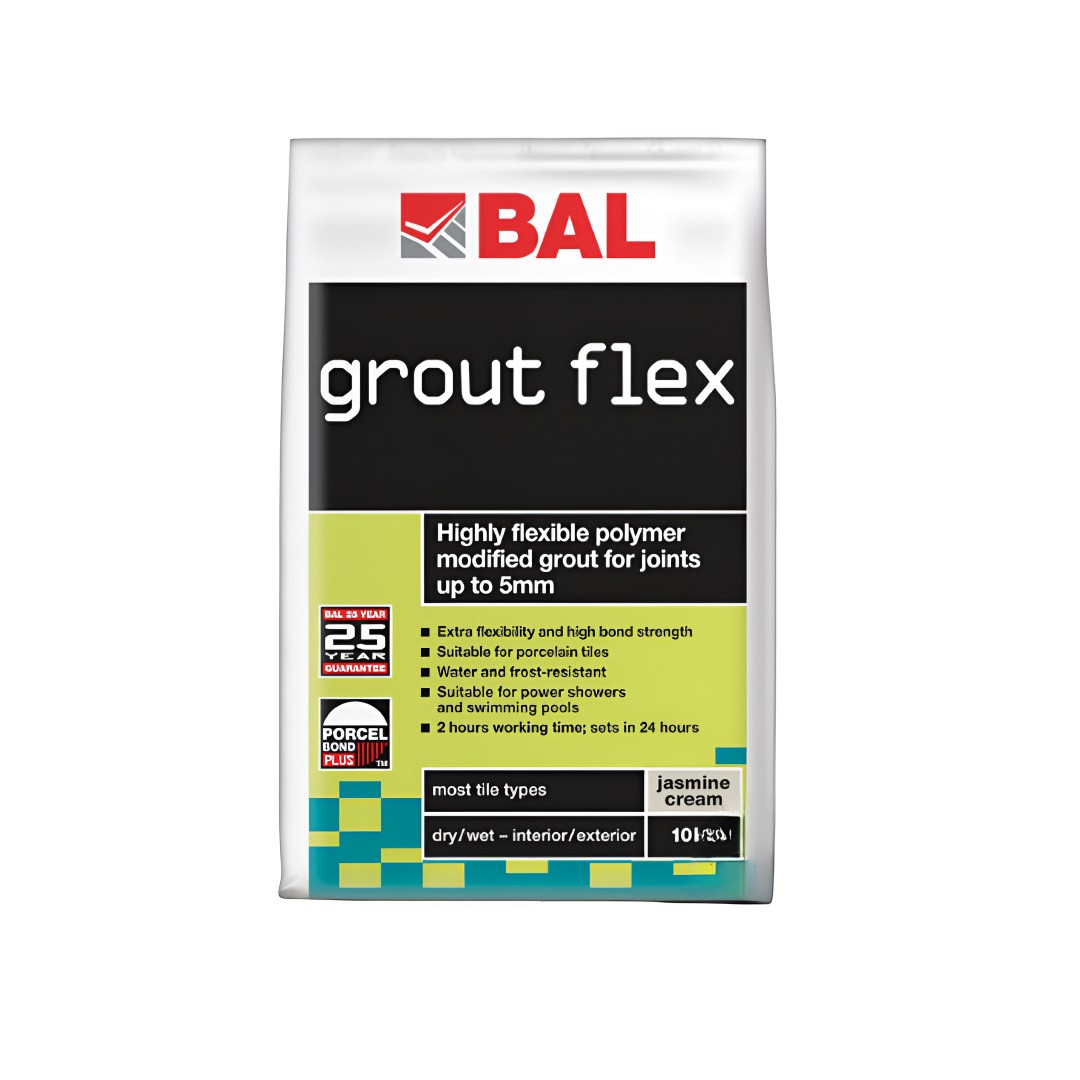 BAL 10KG GROUT FLEX is a wall tile grout, ideal for use in bathrooms and domestic kitchens, suitable for both interior and exterior applications.