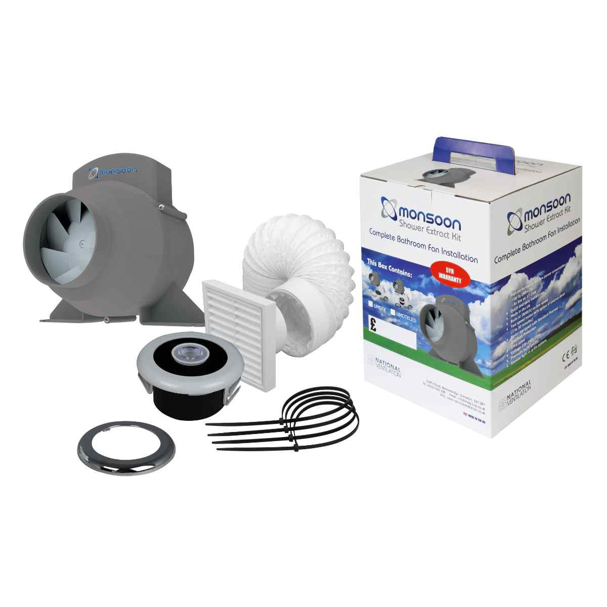 The National Ventilation Monsoon Showerlite LED Extract Kit is a 4" mixflow inline shower light kit, complete with a timer.